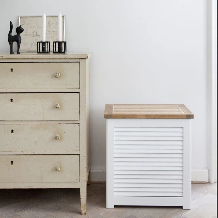 Smart liten skittentøykurv i hvit. Classic skittentøykurv er fremstillet i hvitmalet mahogni og har en dør i teak. Den fine skittentøykurv vil passe inn i de fleste hjem.
