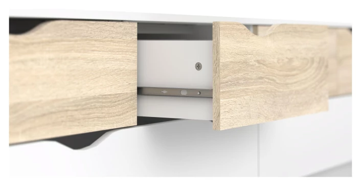 Moderne hvit skjenk. Designet er nordisk inspirert, som gjør skjenken veldig anvendelig. Den hvite fargen, kombinert med treet, skaper et flott utseende. Det organiske materialet skaper en hyggelig stemning i rommet. Skjenken inneholder, med sine otte skuffer masse god oppbevaringsplass.