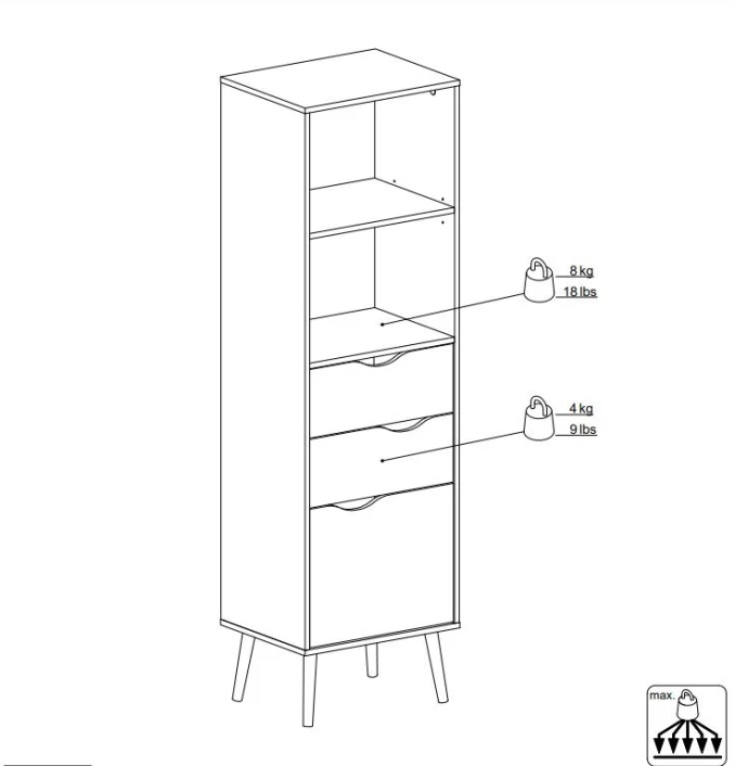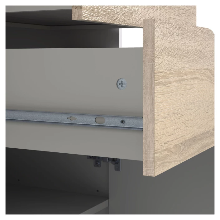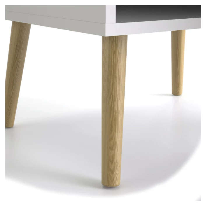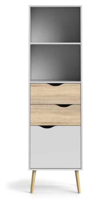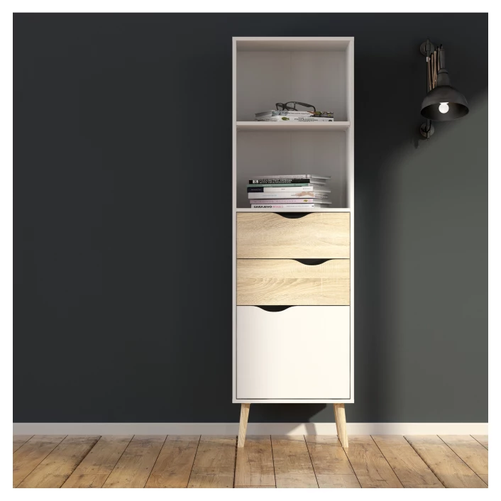 Fin og moderne smal hylle i skandinavisk stil. Hyllen har et flott design med kombinasjonen av hvit og lyst tre samt krom håndtak på skuffene og luken. De flotte bena i lyst tre fullender hyllen.