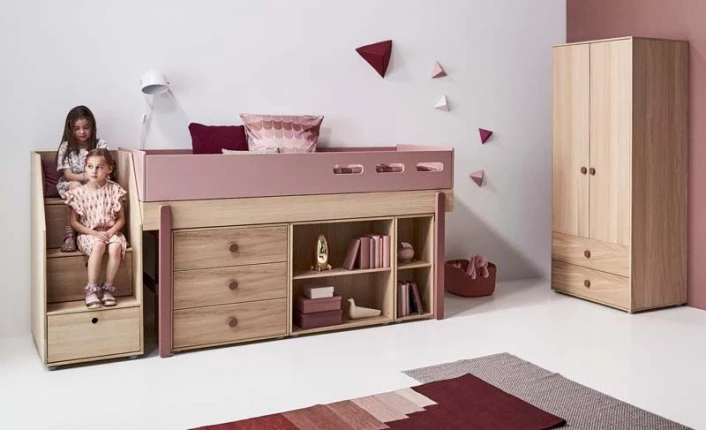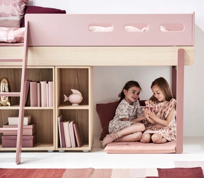 Lavt, smalt hyllemodul i eikefinér på MDF med 1 hylle. Passer under FLEXA Popsicle halvhøy senge.