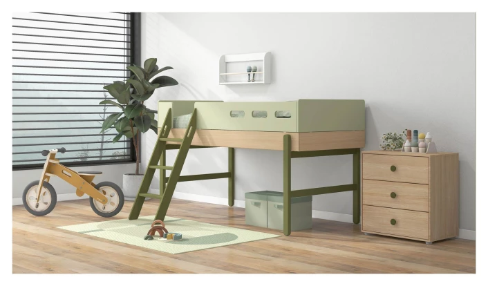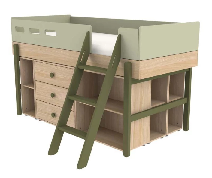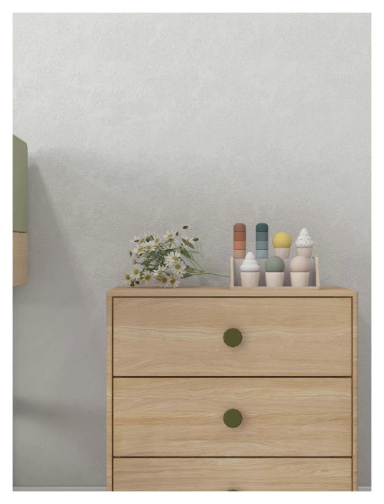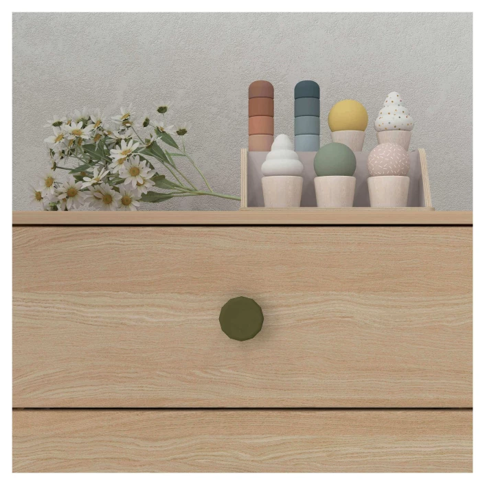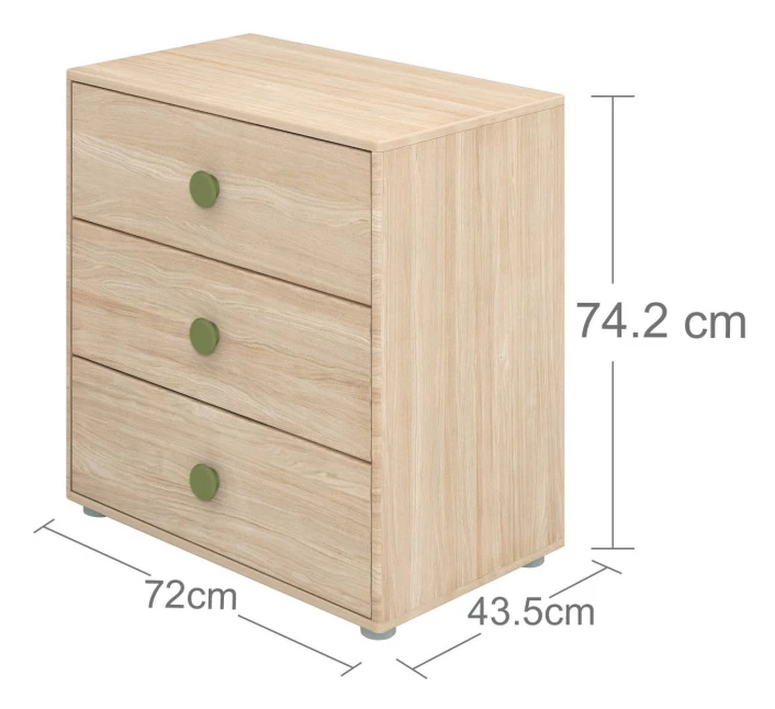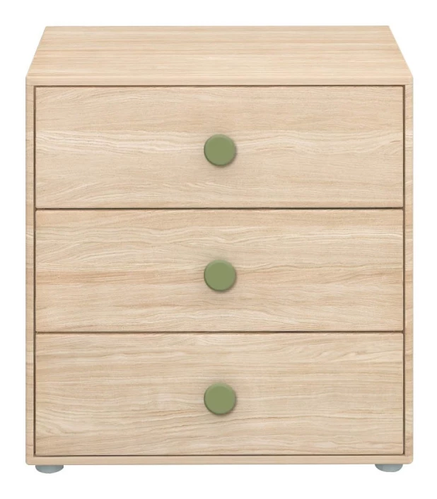 Kommode i eikefinér på MDF med 3 skuffer med grønne håndtak. Passer under FLEXA Popsicle halvhøy seng.