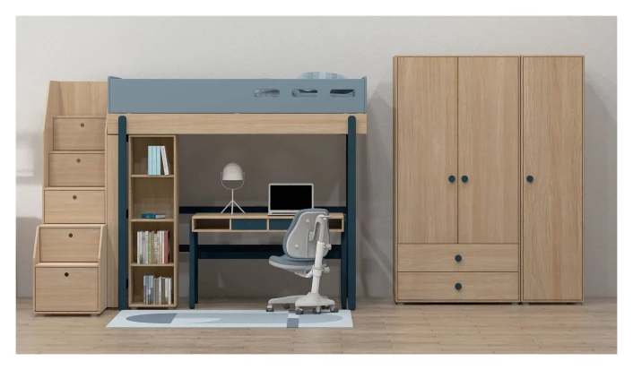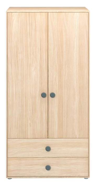Høyt garderobeskap i eikefinér på MDF med 2 døre, 2 skuffer og blå håndtak.