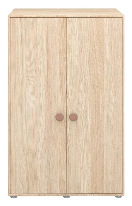 Lavt garderobeskap i eikefinér på MDF med 2 dører og rosa håndtak. Passer under FLEXA Popsicle høyseng.