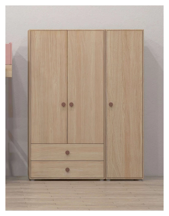 Smalt, høyt skap i eikefinér på MDF med én dør og rosa håndtak.