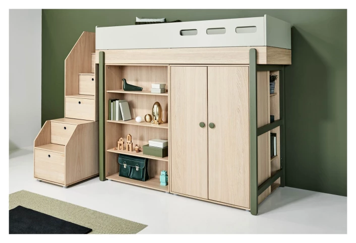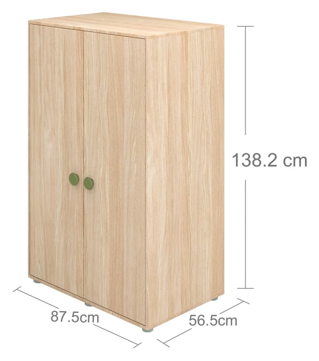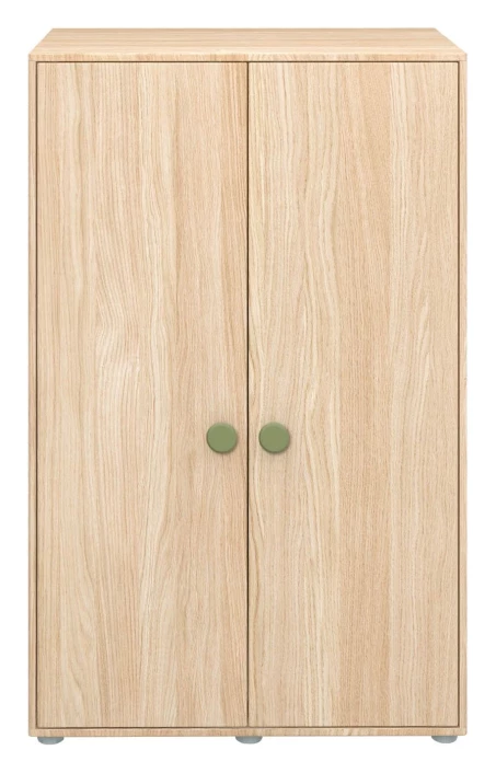 Lavt garderobeskap i eikefinér på MDF med 2 dører og grønne håndtak. Passer under FLEXA Popsicle høyseng.