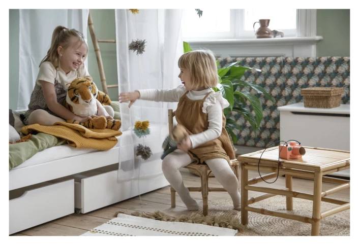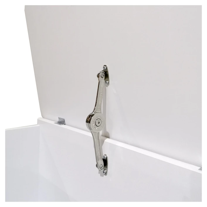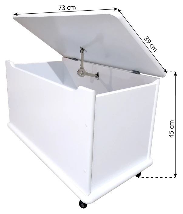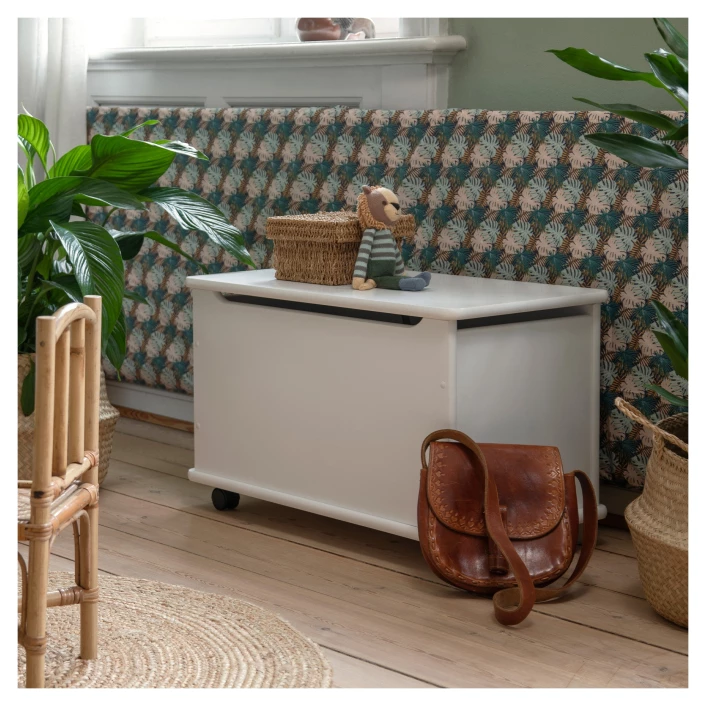 Fin, hvit leketøyskiste fra Hoppekids. Kisten gir god oppbevaringsplass til bamser, leker og annet. Hjulene gjør at kisten kan flyttes rundt og gjøre ryddeprosessen mye lettere. Lokket har soft-close funksjon, så barnet ikke klemmer fingrene.