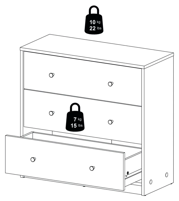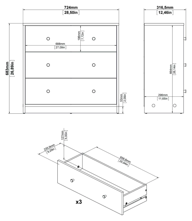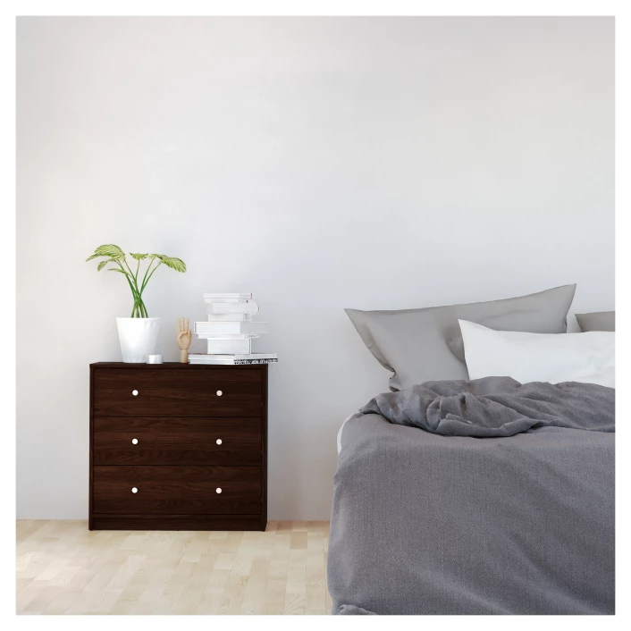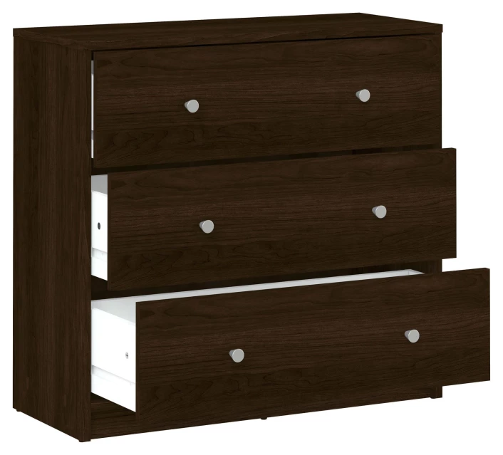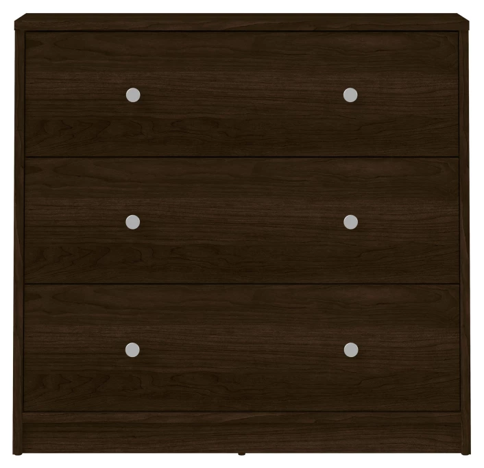 Pen kommode i mørkebrun. Kommoden har tre gode skuffer med to håndtak på hver skuffe. En kommode som denne egner seg både i soverommet, stuen eller hallen.