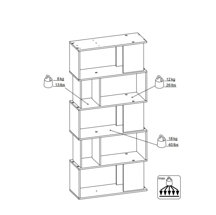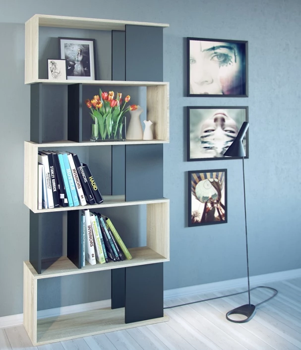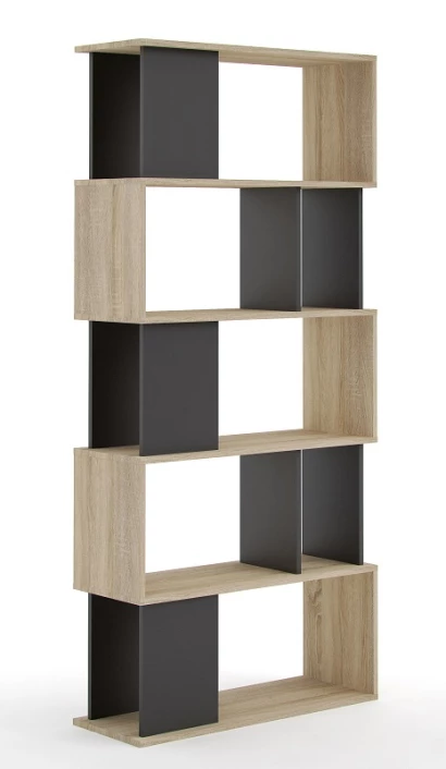 Trendy og annerledes reol i lyst tre. Det assymetriske møbelet bryter de rene linjene i hjemmet og tilføyer humor og en leken stil til innredningen. Kombinasjonen av det lyse treet og den mørke fargen gir en fin kontrast og et stilig design, som passer godt inn i moderne hjem.