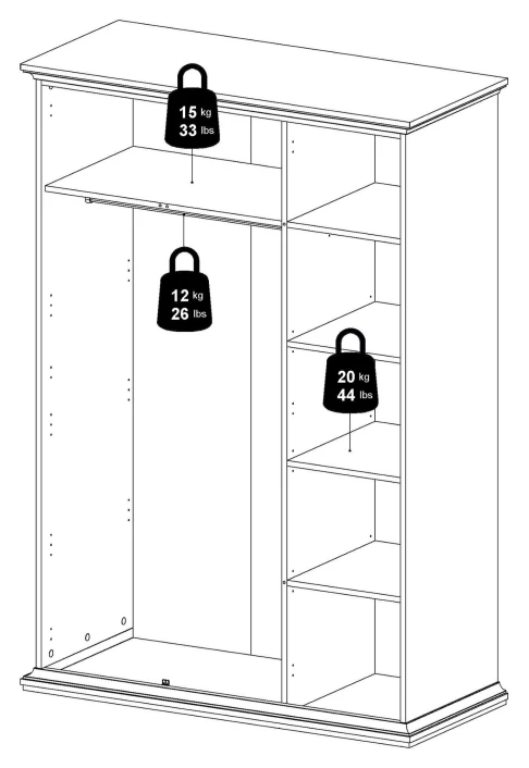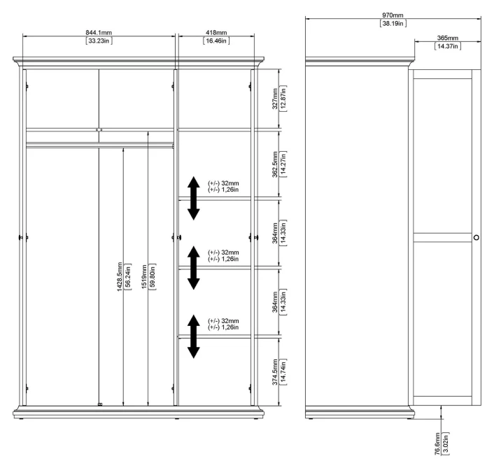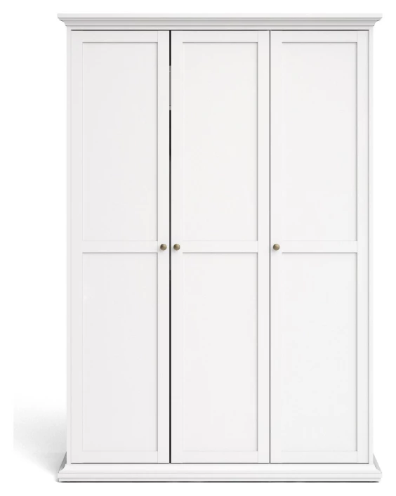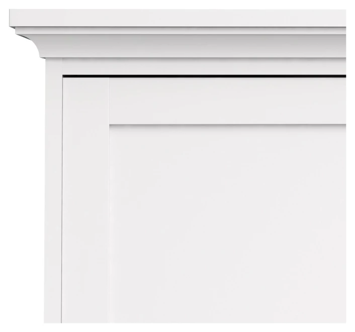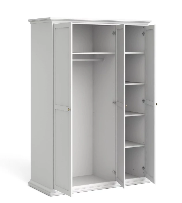 Garderobeskap i hvit melamin. Skapet har en bred modul med bøylestang med topphylle og en smalt hyllemodul. Garderobeskapet har to dører med antikk-lignende metallgrep som fremhever det romantiske uttrykket.