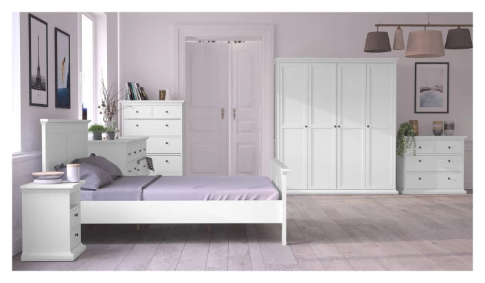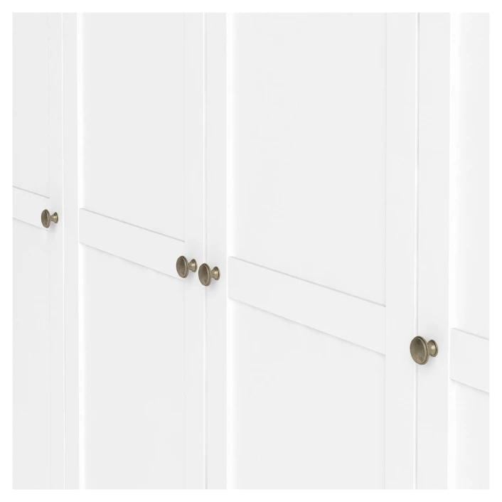 Garderobeskap i hvit melamin. Skapet har en bred modul med bøylestang med topphylle og to smale hyllemoduler. Garderobeskapet har to dører med antikk-lignende metallgrep som fremhever det romantiske uttrykket.