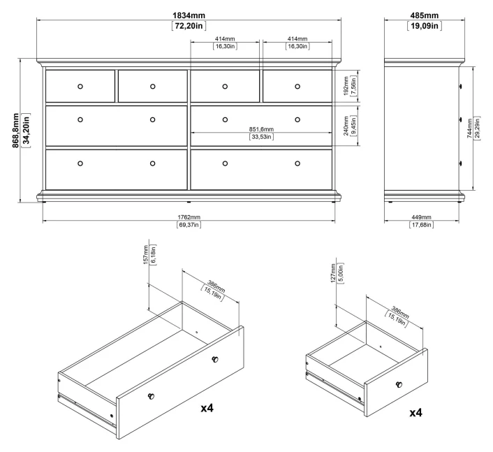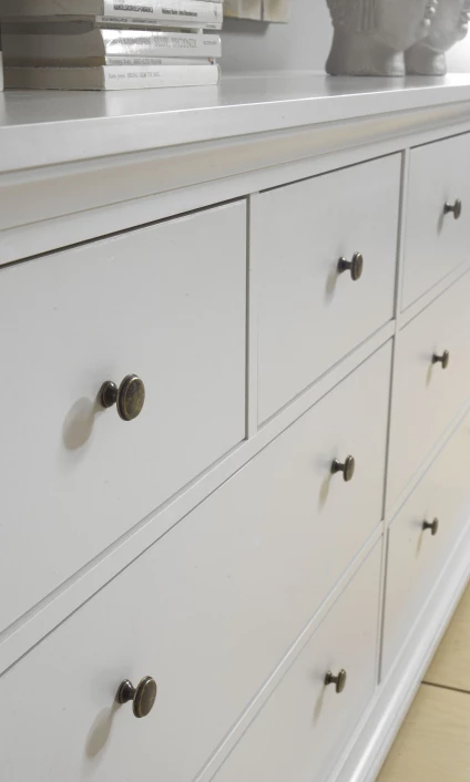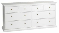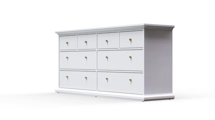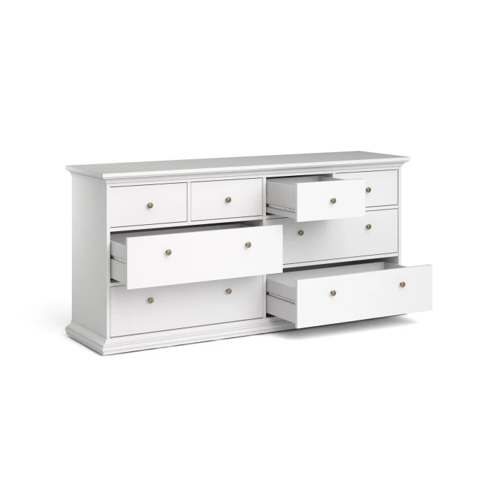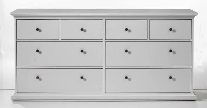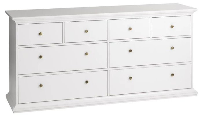 Flott kommode med et romantisk uttrykk som passer til Paris-serien. Kommoden har åtte skuffer med antikk-lignende metallgrep som fremhever stilen. Laget i hvit melamin.