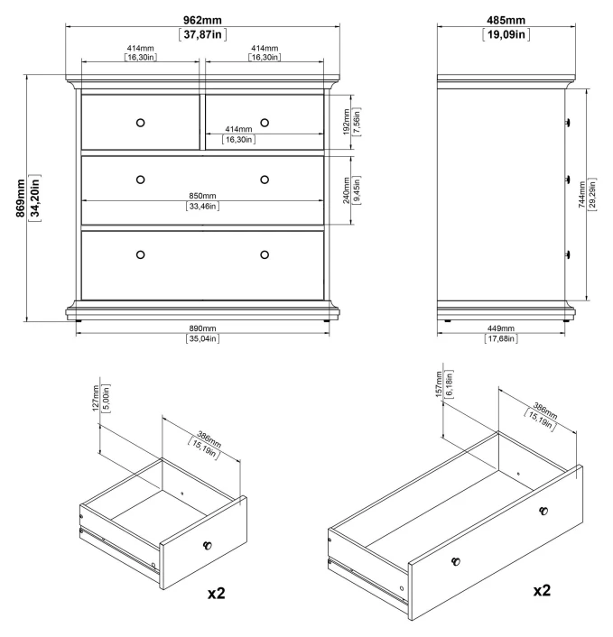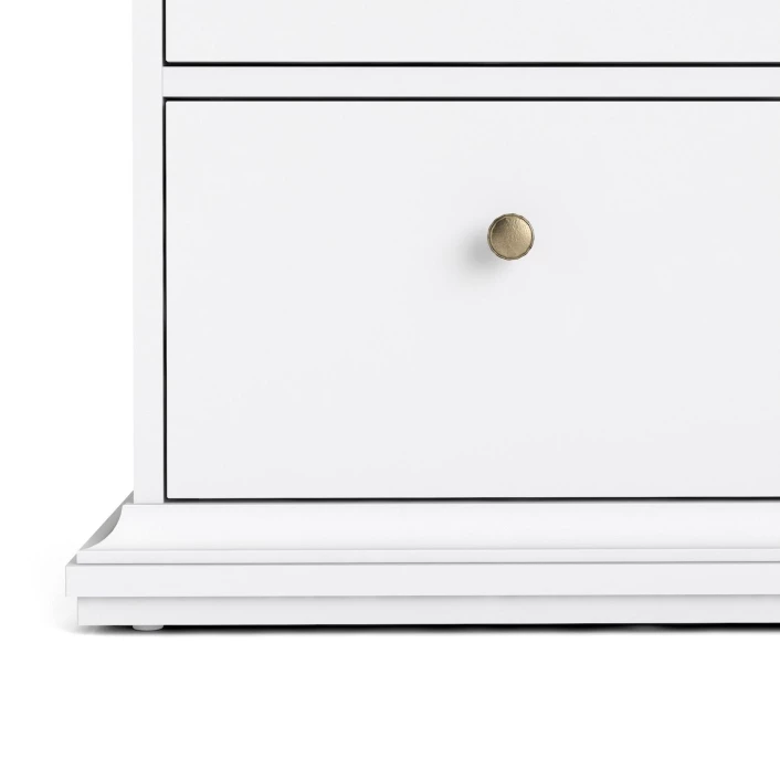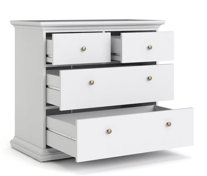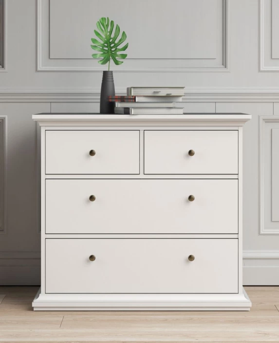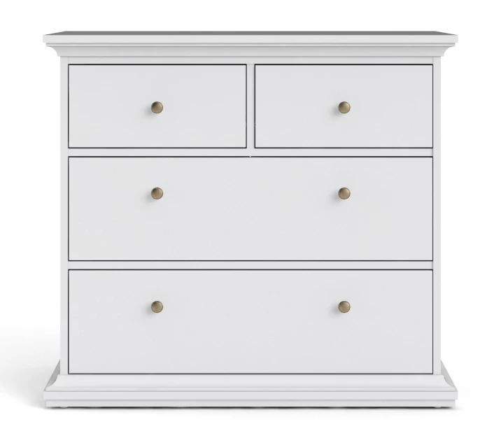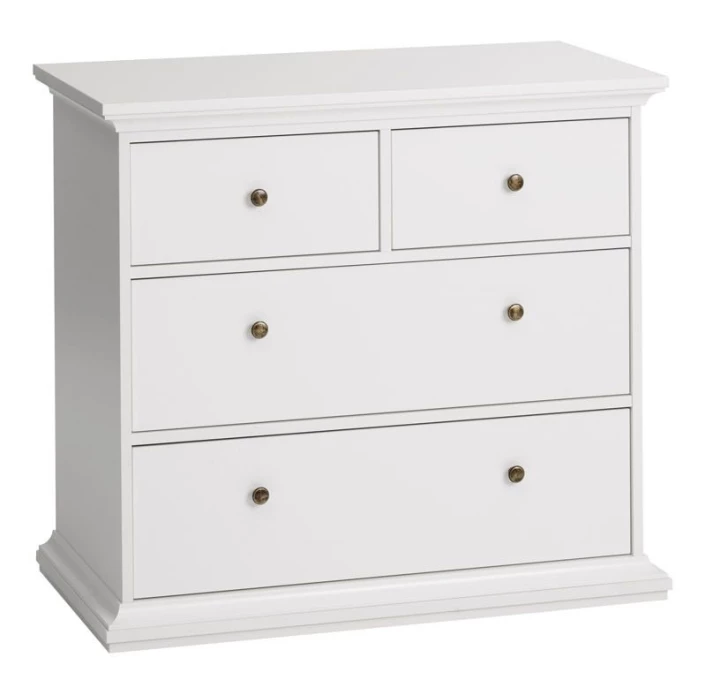 Flott kommode i hvit melamin med til sammen fire skuffer – to smale og to brede – med antikk-lignende metallgrep som fremhever det romantiske uttrykket. Den fine kommoden er flott både til entréen, mellomgangen og soverommet – det er mange muligheter!