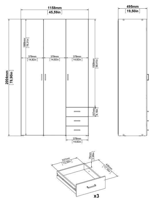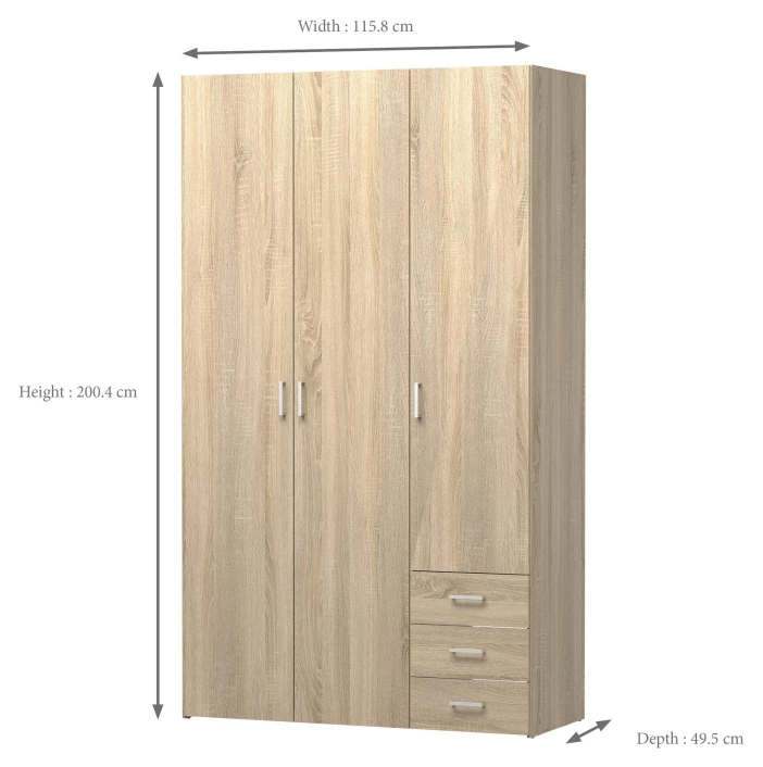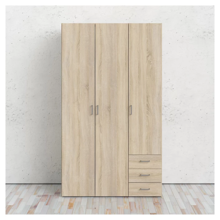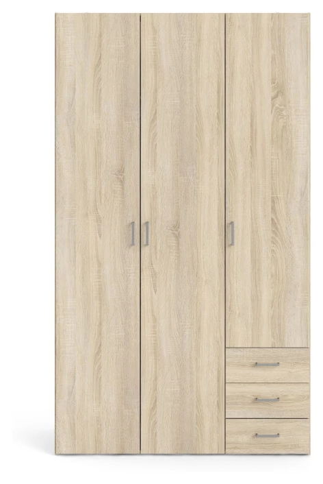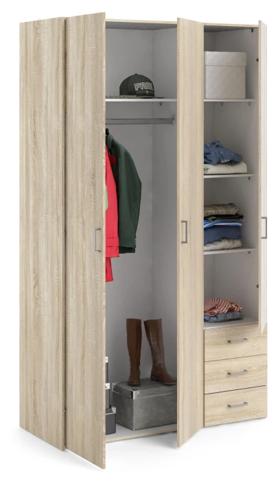Flot og simpelt garderobeskab i lyst træ. Skabet har tre skuffer og tre låger. I lågen over skufferne er der fire hylder, hvorimod der i de to øvrige låger er en lang bøjlestang, samt en aflang hylde øverst.