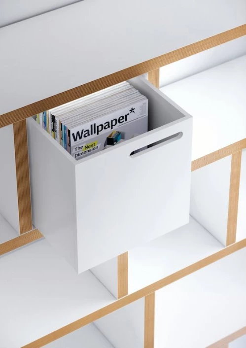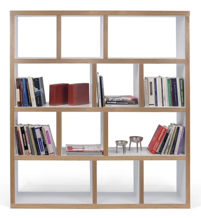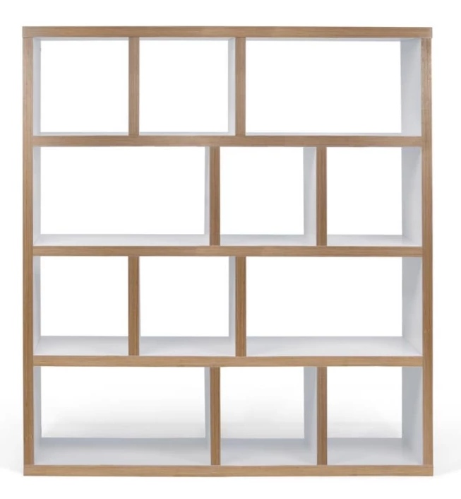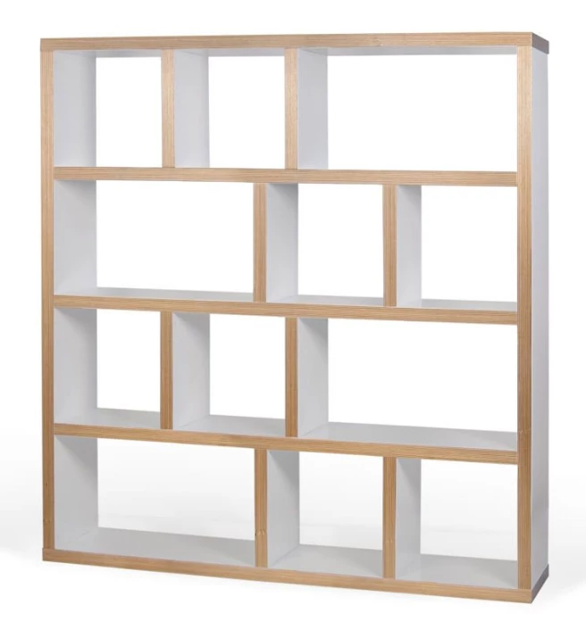 Moderne reol og romdeler i natur/hvit. Reolen har fire seksjoner med 12 asymmetriske oppbevaringsrom. Reolen kan kombineres med oppbevaringsbokser i flere ulike farger som passer i de kvadratiske rommene. Det perfekte møbel som passer i alle rommene.