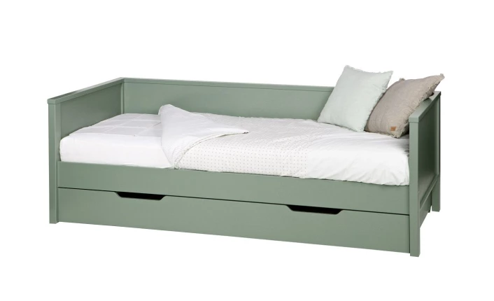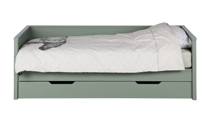 Vil du gjerne utnytte plassen mest mulig under barnesengen, så er denne smarte Nikki junior sengeskuffe fra Woood en perfekt løsning. Sengeskuffen passer til Nikki junior Barneseng fra Woood. Sengeskuffen er bred og rommelig, så det er masse av plass til opbevaring av diverse lekesaker. Den er laget i en smart grønn farge, som gir et pift til innredningen i barnerommet. Materialet består av furutre , som er sertifisert. Anskaffelsen av materialene er derfor miljøvennlig.